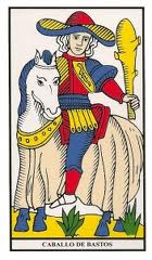 En las lecturas el caballo de bastos muestra su confidencialidad, su apasionado estilo de involucrarse en las situaciones que puede se un aspecto de nosotros o de alguien más o de una atmósfera en general. Necesitamos preguntarnos ¿Esta carta me ayuda o me esta perjudicando?.