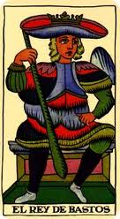 Si esta carta, a veces puede representar a una persona física, si esta carta se gira, eso indica que esa persona está bloqueada o tiene algún tipo de perturbación; o quizás tiene alguna mala influencia en su persona. Si de la otra manera veíamos cualidades en la carta, entonces girada muestra estas cualidades alteradas; el Rey muestra una persona poderosa y comandante, ahora puede significar una persona intolerante con las debilidades de los demás. Vemos que el fuego natural puede acabar provocando que esta persona se vuelva cínica o con miedo. Porque él es el Caballero de Bastos él no pierde su fuerza, pero se vuelve templada, más comprendiendo a los demás y al mismo tiempo más severo en su actitud en la vida, que ya nunca más aparece como un concurso fácil.